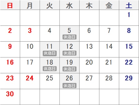 | 定休日 | : 毎週水曜日・第2、第3火曜日 |